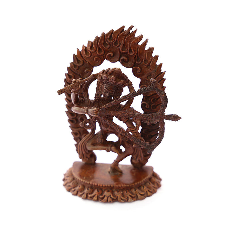 This Kurukulle statue is made in accordance with the lineage of Chokgyur Lingpa. It is distinguished by the headdress and implements in the form of flowers, rather than the usual skulls. The statue is made of oxidized copper and consecrated with mantras and prayers by the senior monks of Ka-Nying Shedrub Ling Monastery.