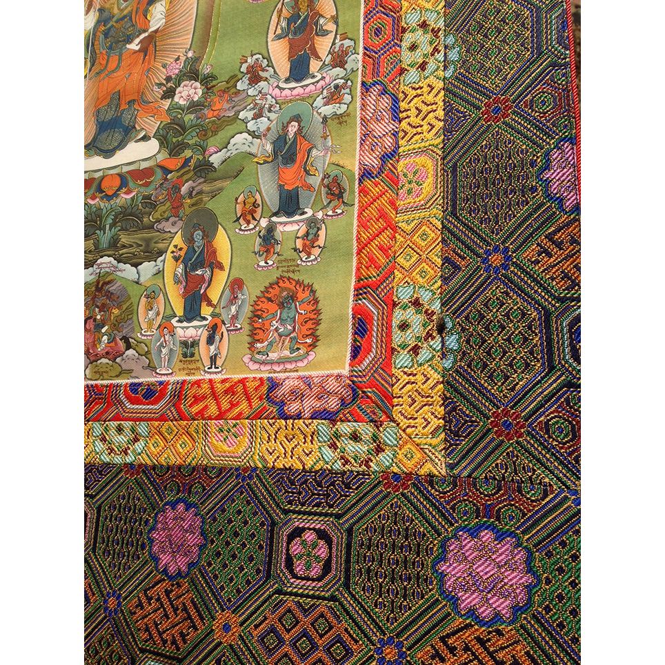 Sampa Lhündrup is a special manifestation of Guru Rinpoche, in which the Guru appears in a standing posture—ready to act—surrounded by his thirteen emanations. In this form the Guru grants the practitioners protection from all calamities. He guards us against conflict, disease, poverty, obstacle-makers, vicious animals, disturbances of the four natural elements, robbers, sudden death, the intermediate state, clinging to reality, and the sufferings of the six classes of beings.